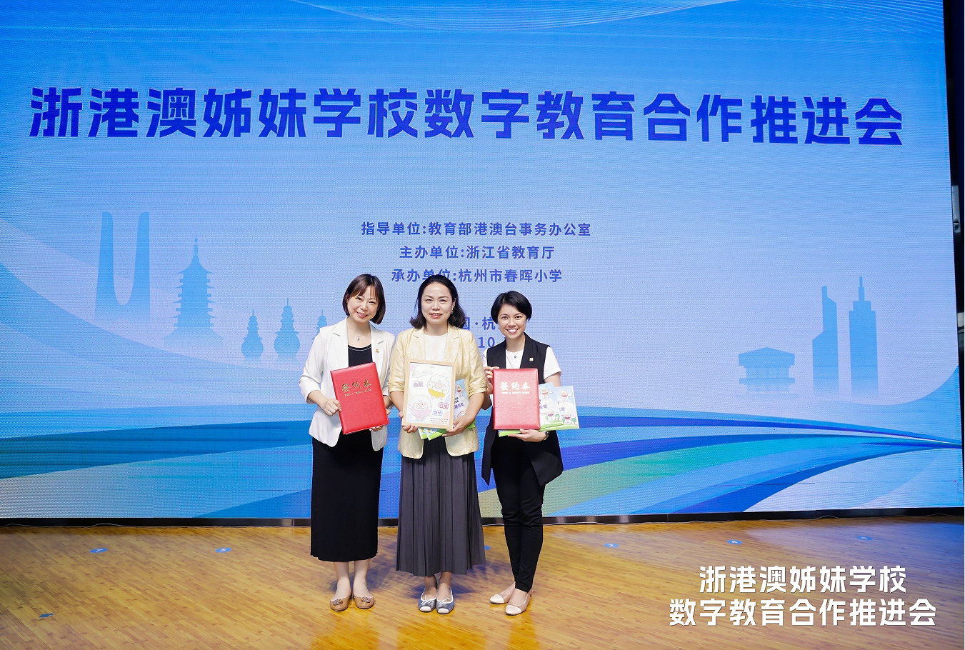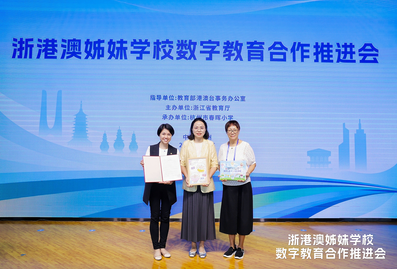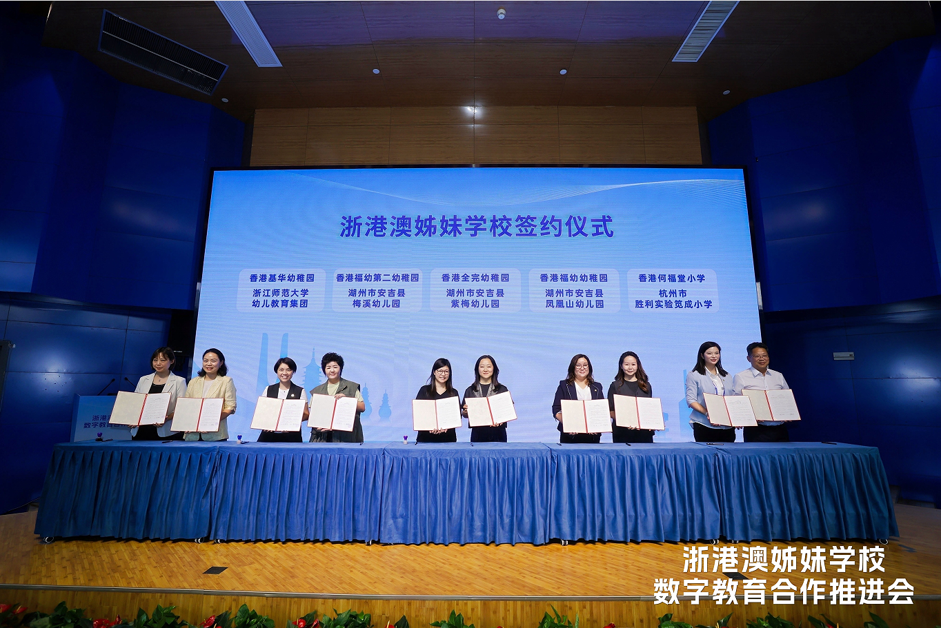 2025年10月15日,在教育部港澳台办、香港中联办、澳门中联办支持下,由浙江省教育厅主办的“浙港澳姊妹学校数字教育合作推进会”在杭州市春晖小学举行。浙师大幼教集团与香港基华幼稚园、香港福幼第二幼稚园郑重签署姊妹学校合作协议,成为“浙港澳姊妹校数字教育联盟”首批签约单位。