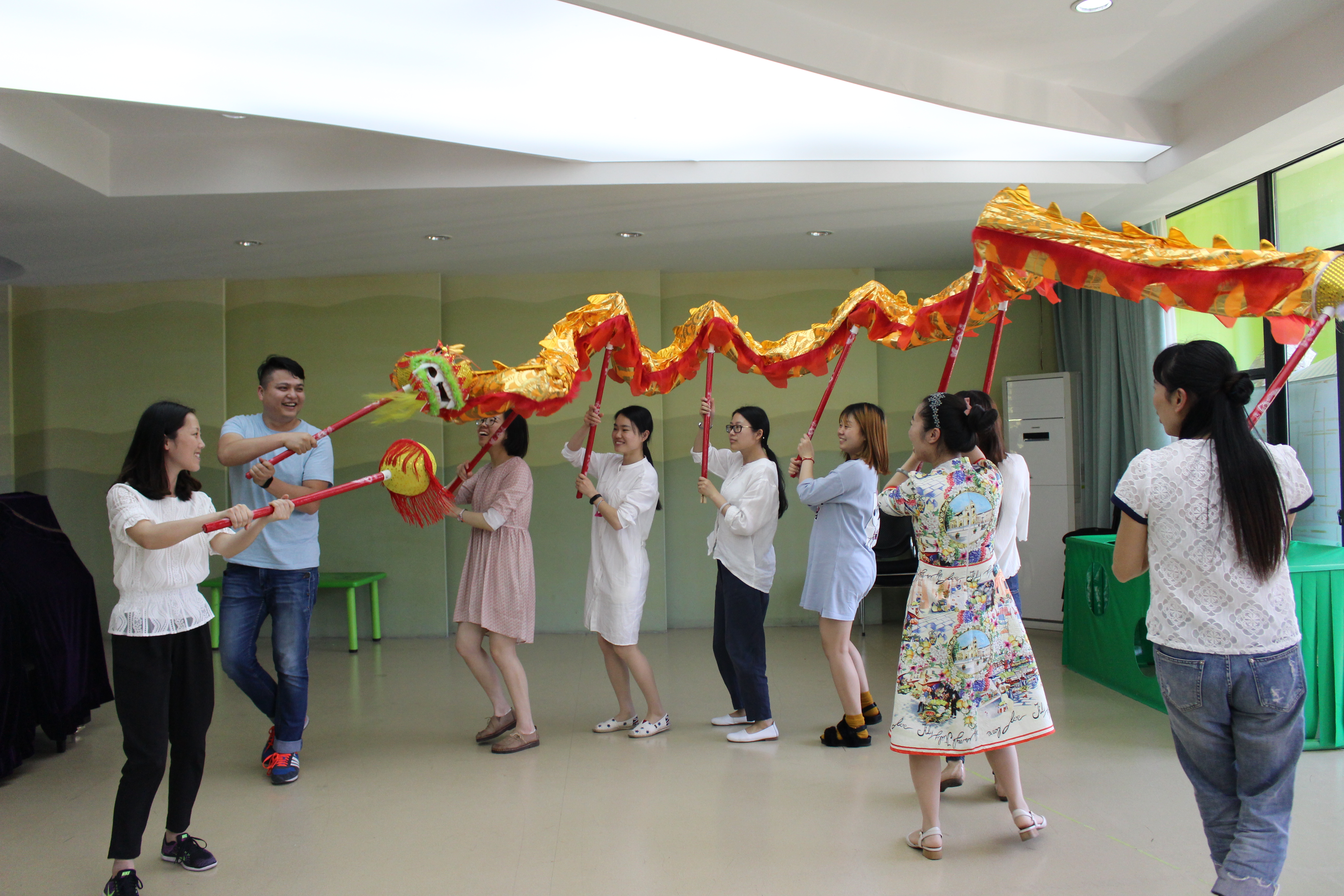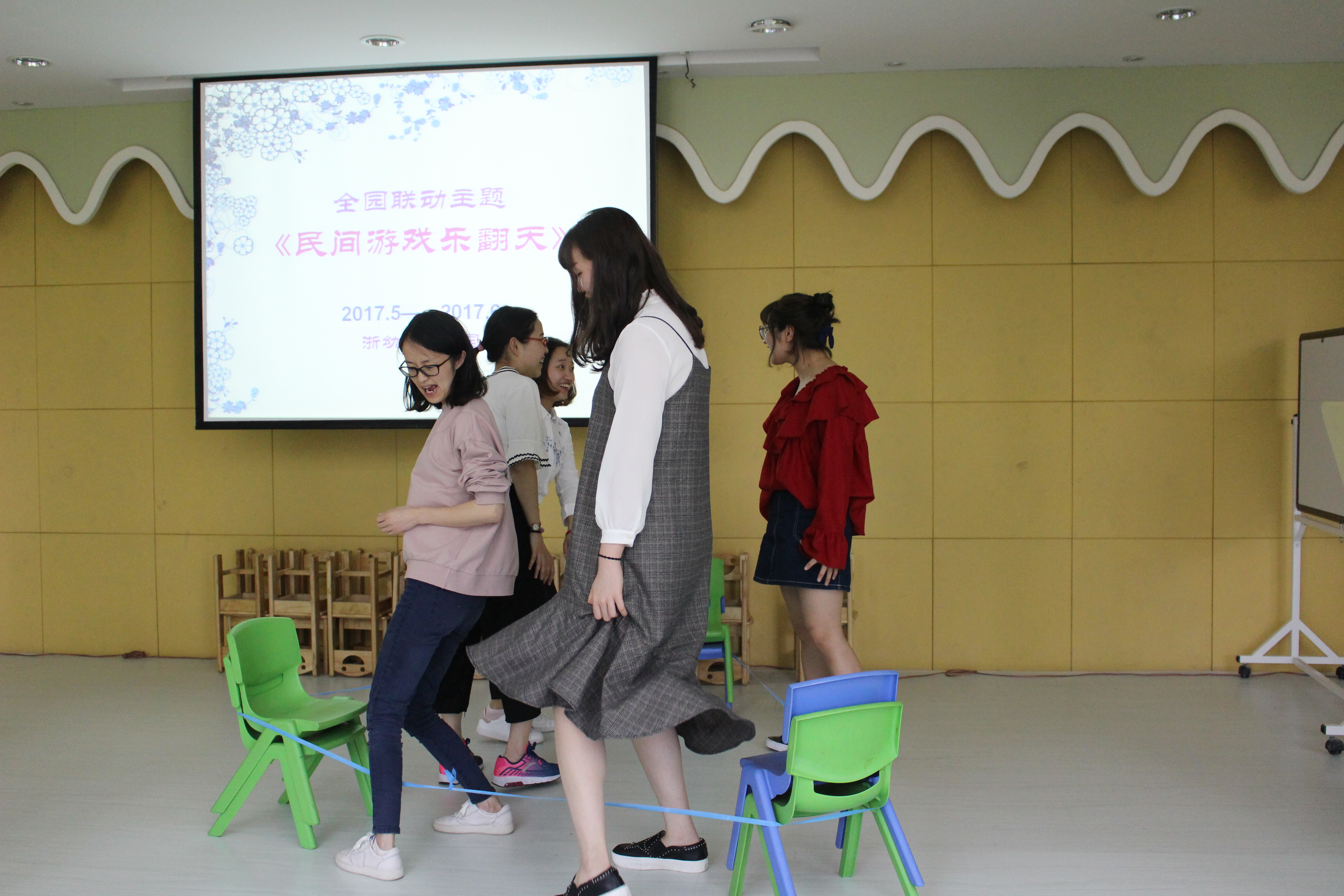 活动中老师们体验了几种传统的民间游戏。舞龙、五彩包、跳皮筋、丢手绢、杭州童谣,通过玩,让老师们首先体验到民间游戏的多样与趣味性。