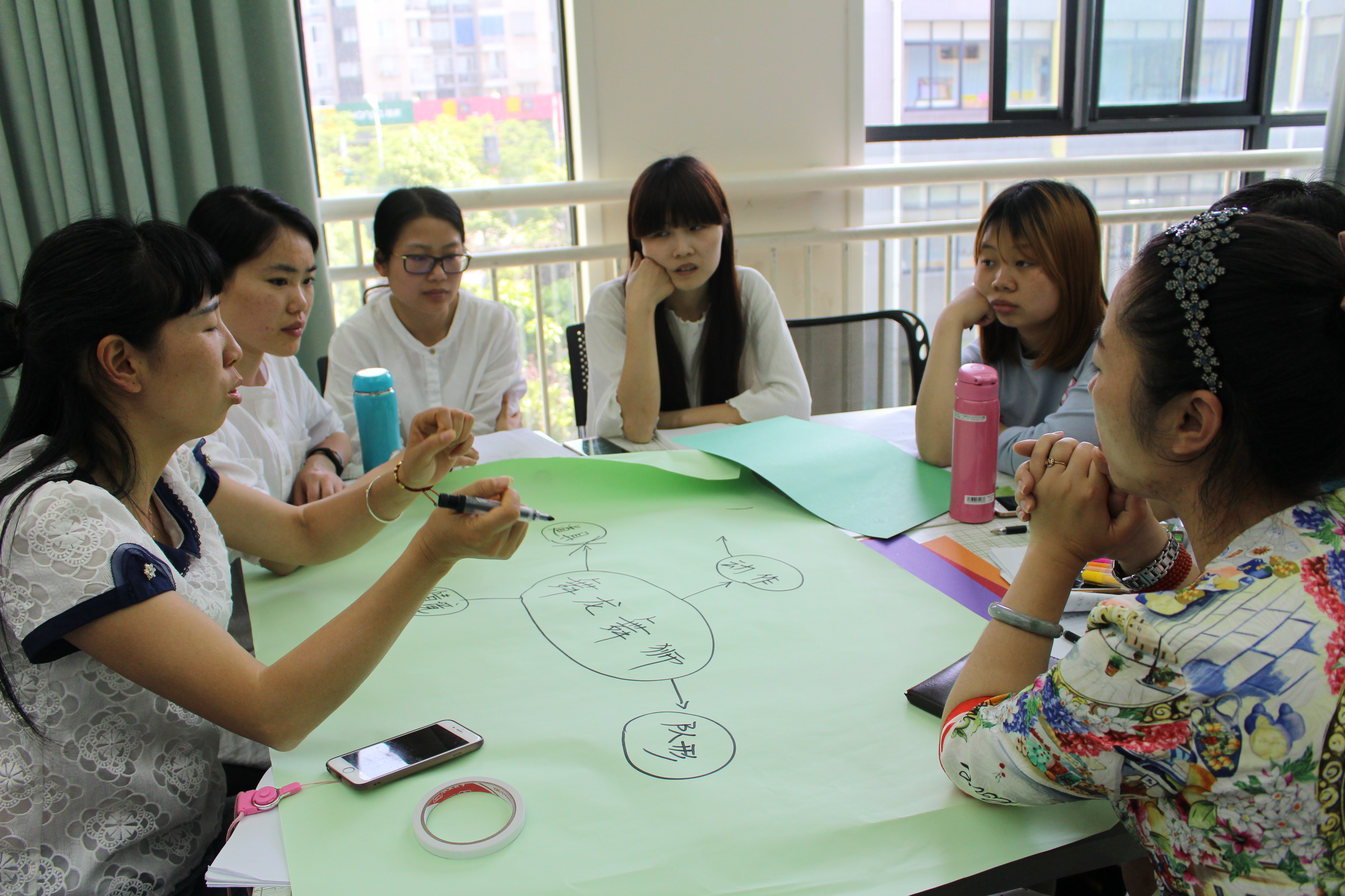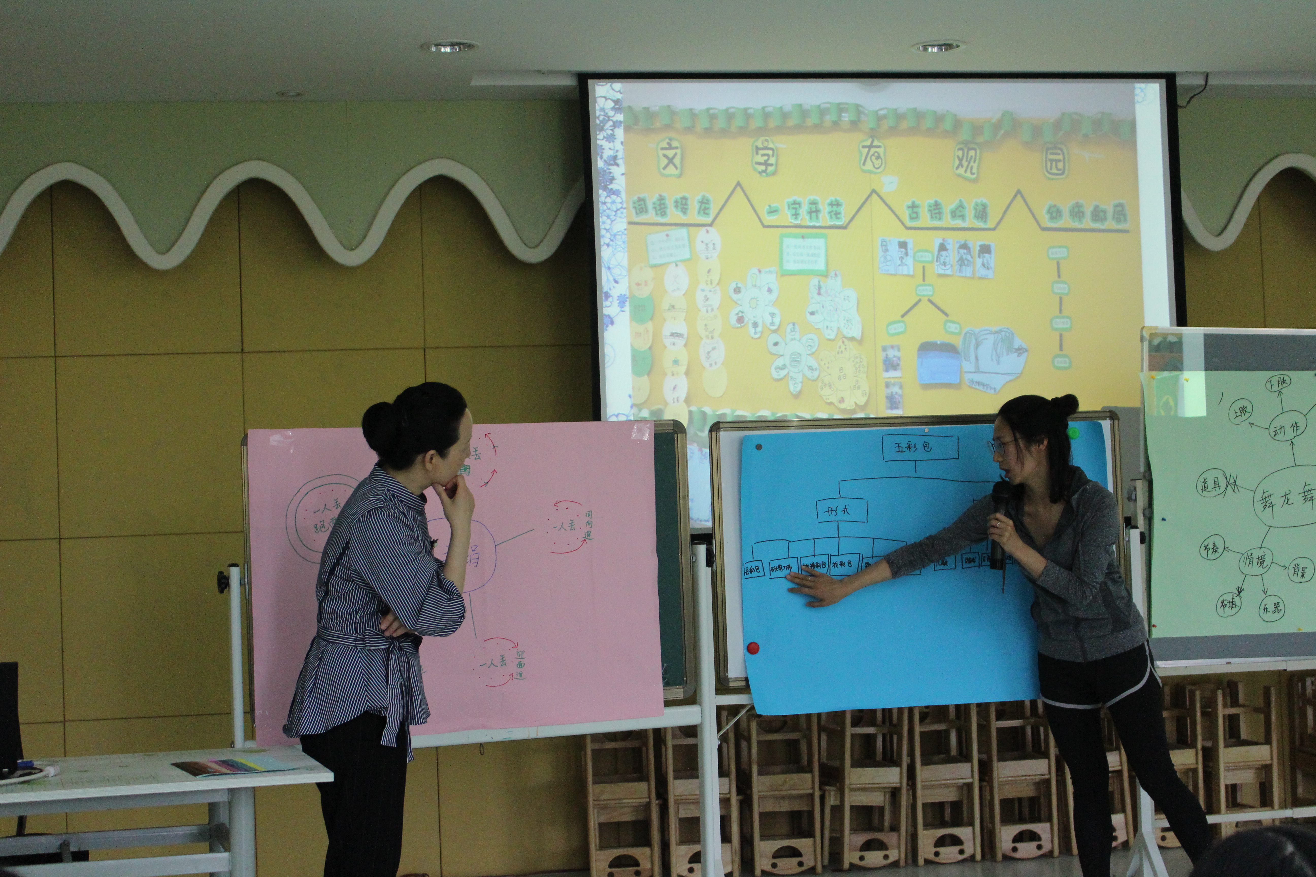 体验过后,朱园长给大家梳理总结了主题活动的目标、线索,提供了丰富的适合每个年龄段玩的民间游戏,并结合研究案例《跳房子》,启发老师们学习运用思维导图来解读活动。老师们分小组展开讨论并展示成果。思维导图能够为我们理清主题思路,在讨论、交流中不断的学习,拥有更严谨的教学思路。