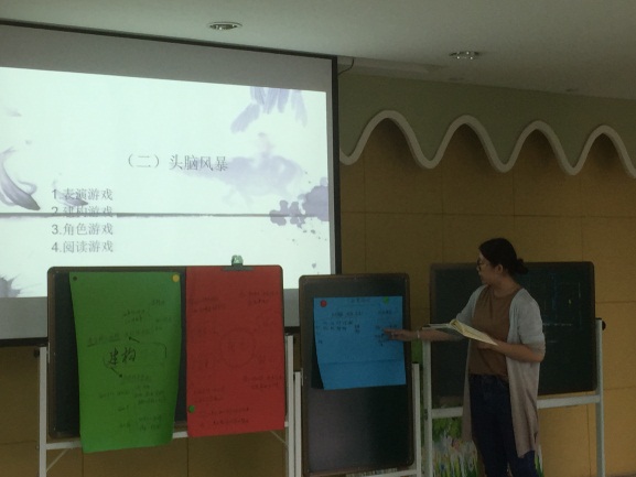 2017年10月12日中午,“游戏联盟”在王超逸老师的主持下开展了第一次研修活动,七所游戏联盟园的教研负责人和老师参与了这次研讨活动。本次活动的研讨主题是:寻找游戏中支持幼儿语言发展的契机。研讨目标是:通过研讨活动回顾《学前儿童语言学习与发展核心经验》的内容,了解各类游戏中隐含的语言学习内容,寻找游戏过程中教师支持幼儿语言学习的契机。研讨过程分为三个部分,第一部分是玩游戏,辨析“游戏与语言学习的关系”,第二部分是头脑风暴,寻找各类游戏中支持语言核心经验学习的契机,第三部分是交流研修设想与困惑。
